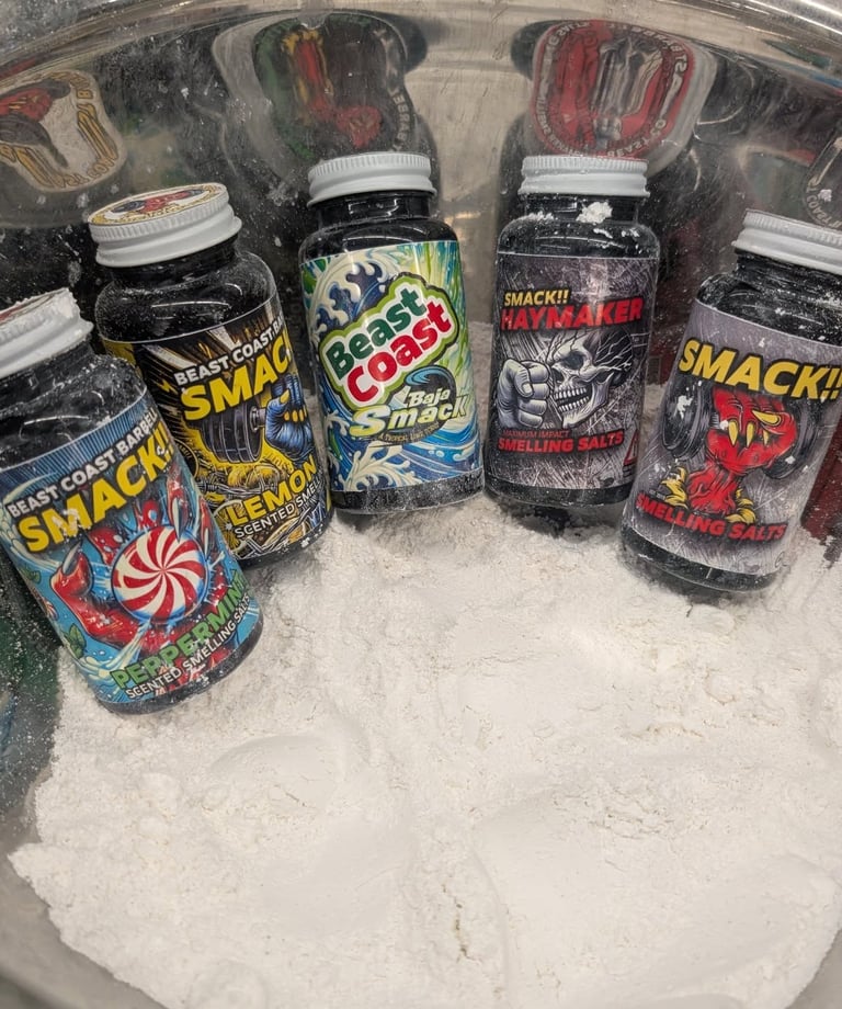 Our smack smelling salts are the perfect solution to revitalize your senses and energize your mind. Available in a variety of strength levels and scents, each option is designed to provide a refreshing boost when you need it most. Experience a gentle awakening with our lighter "slap" scents or an intense punch to the face with our stronger variants. Whether you prefer invigorating blue razz, soothing peppermint, or zesty lemon, our selection ensures there’s a fragrance to suit your preference. Don’t let fatigue hold you back—grab a bottle of our smack smelling salts and take on the day!